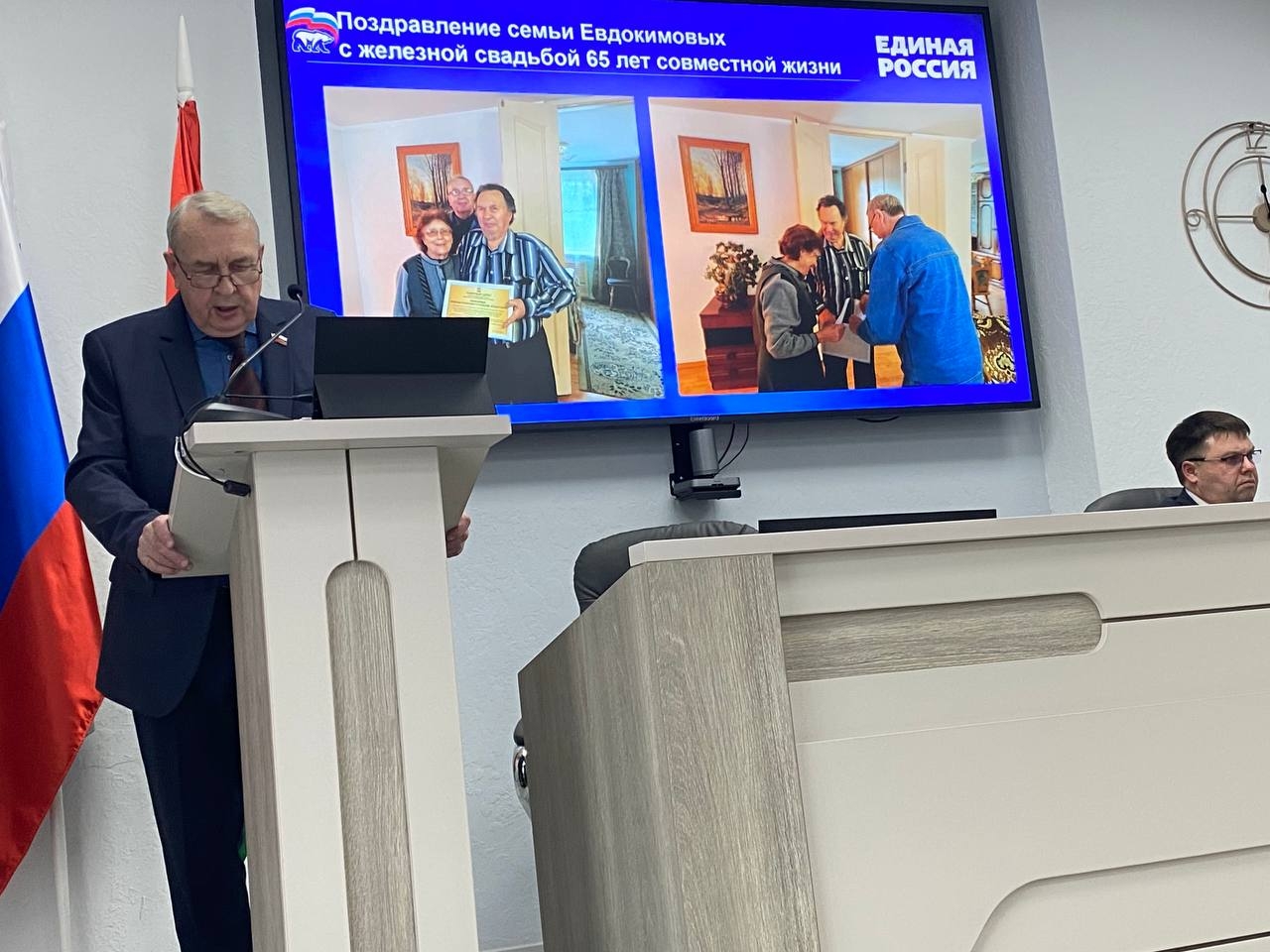 С отчетным докладом выступил Секретарь местного отделения Владимир Васильевич Харланович, отметив результаты работы отделения по приоритетным задачам – участие в мероприятиях, посвященных 80-й годовщине Победы в Великой Отечественной войне, в волонтерских акциях в поддержку участников СВО и членов их семей, а также партийных проектах, реализуемых в рамках Года защитника Отечества и Года муниципального депутата.